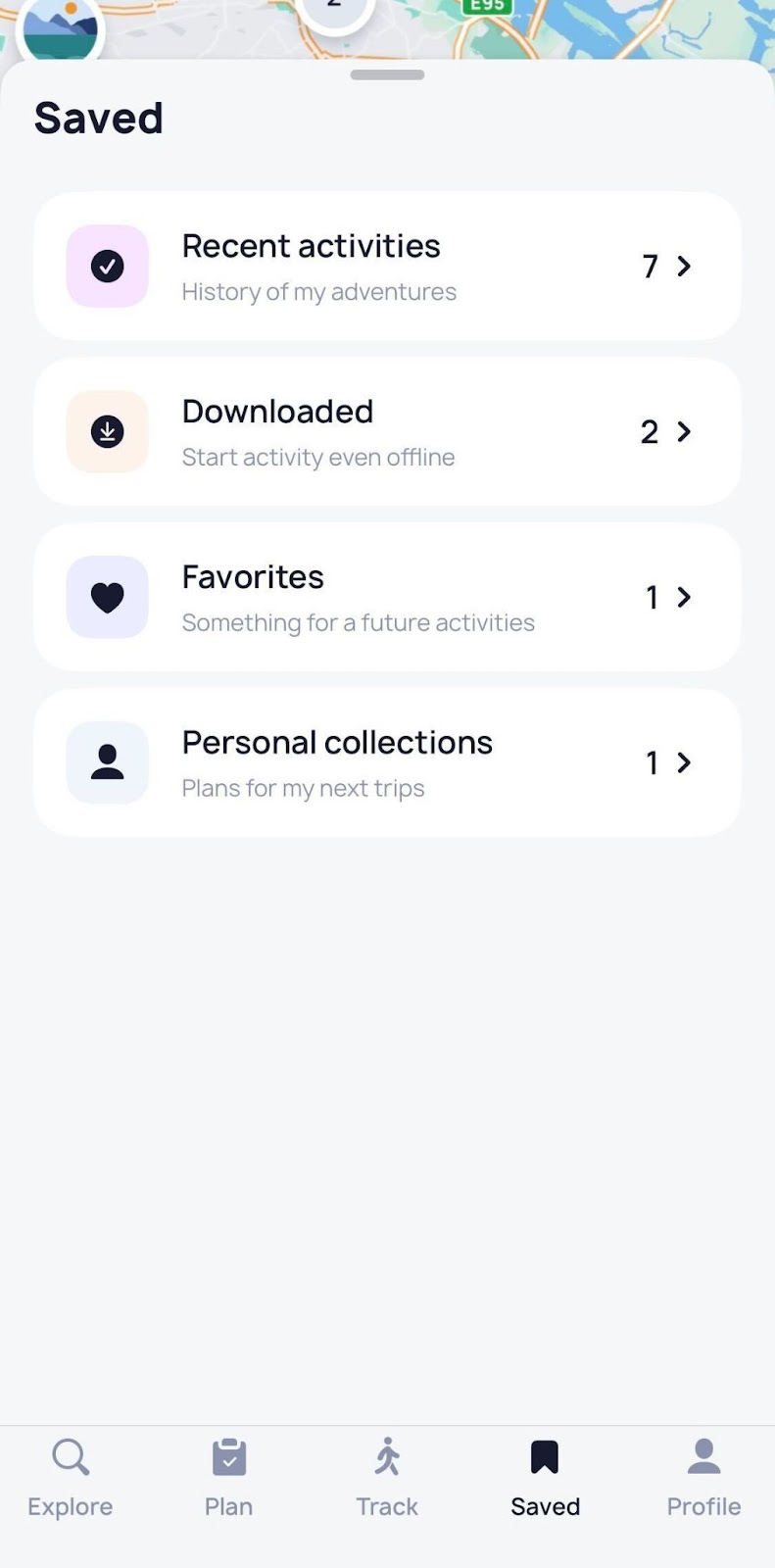 In the “Saved” tab, you’ll find the history of your recent activities, your favorite routes, downloaded trails, and personal collections.