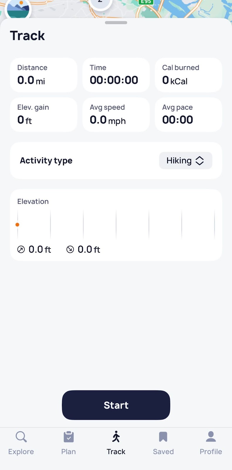 The “Track” tab is the main instrument for tracking your own trails. After you press the “Start” button, the app will track distance, elevation, calories burned, and your average speed. It also lets you select the map type (outdoors, satellite, light, or dark) and the activity type.