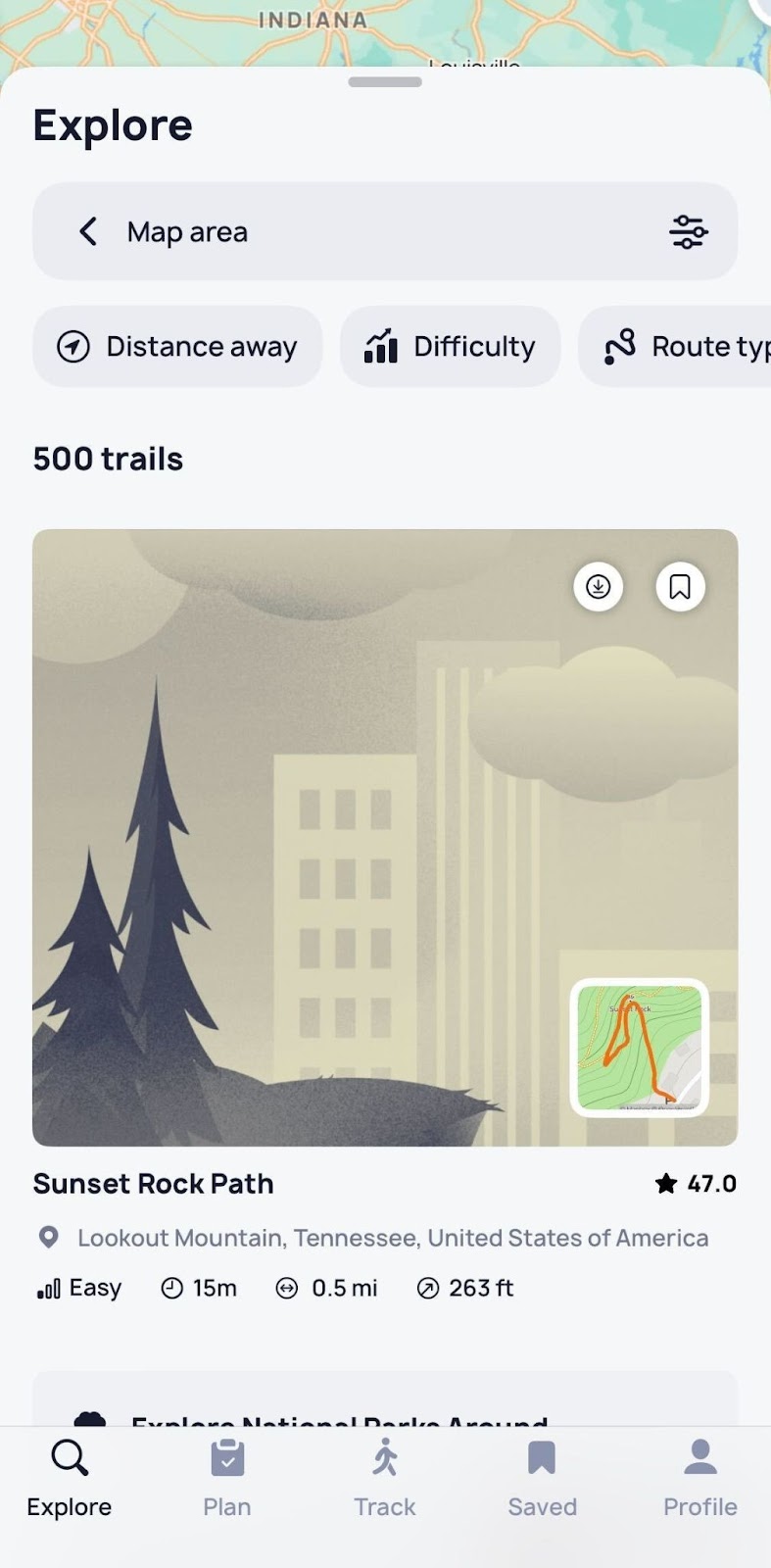 The “Explore” tab lets you see routes in your area. You can choose the preferred trail using different filters, such as “difficulty level,” “distance away,” “length,” and “activity type.” And if you are planning a hike with the whole family, you can enable the “Kids friendly” option and see the routes suitable for activities with children.