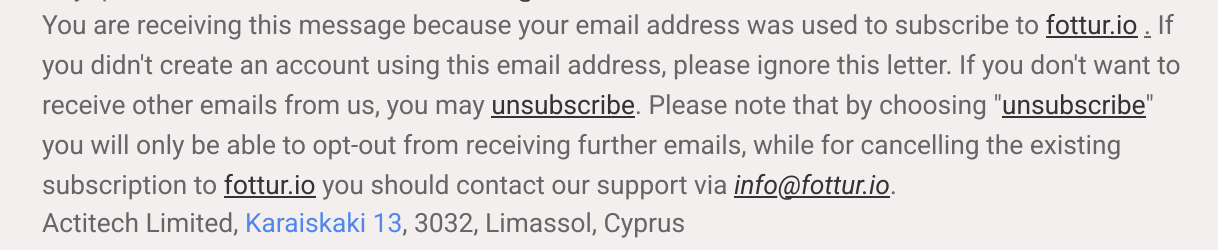If you no longer want to receive any emails from us, you can unsubscribe from them at the bottom of the email using the ‘unsubscribe’ hyperlink, as shown below:
